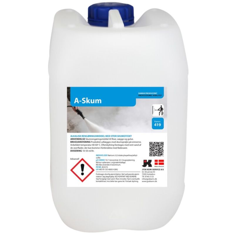A-skum er et effektivt alkalisk skumrengøringsmiddel, udviklet til professionel rengøring i fødevareindustrien og andre miljøer med høje hygiejnekrav. Den skummende formulering sikrer en længere kontakttid på lodrette og svært tilgængelige flader, hvilket giver en grundig rengøring og høj hygiejnestandard.