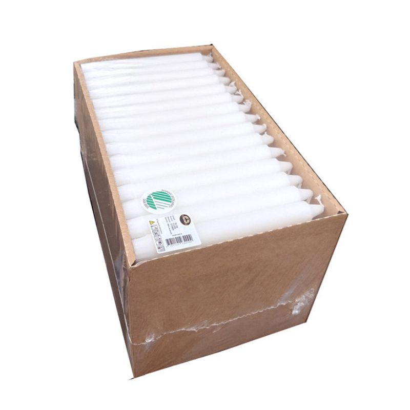 Fremstillet af ren stearin, som sikrer en stabil flamme, en jævn afbrænding og en naturlig hvid farve. Lysene måler 2,4 cm i diameter og 25 cm i højden, hvilket gør dem kompatible med de fleste standard lysestager.